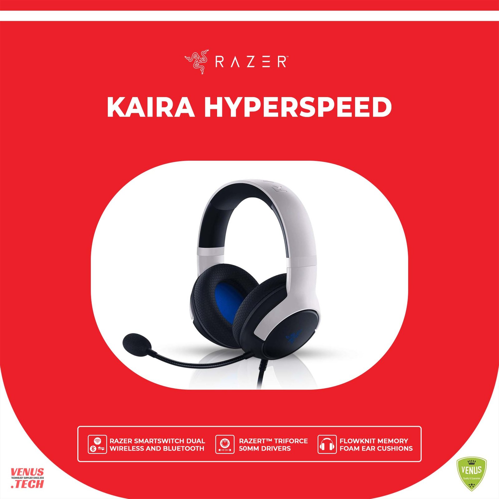 | CONSOLE. MOBILE. MASTERED. Whether you’re on console or mobile, rule both realms with the Razer Kaira for PlayStation—a dual wireless PS5 headset powered by Razer™ SmartSwitch. Capable of connecting to a 2.4 GHz and Bluetooth device at once, enjoy unrivalled convenience as you switch seamlessly between them.RAZER™ TRIFORCE 50MM DRIVERS The Razer Kaira features cutting-edge drivers that can tune highs, mids, and lows separately – producing brighter, clearer sound with richer trebles and more powerful bass.RAZER™ HYPERCLEAR CARDIOID MIC The bendable mic has been fine-tuned to suppress background noise from the back and sides for greater voice isolation, ensuring you’ll always be heard loud and clear.RAZER™ SMARTSWITCH While using the Kaira with the included USB-C dongle, calls from a connected Bluetooth device will automatically come through the headset so you can conveniently take the call then switch back to the game audio without ever removing the Kaira. Do Not Disturb Mode can be toggled on in the Razer Audio app if you want to block incoming calls from coming through, while a dedicated button on the headset allows you to manually switch between HyperSpeed Wireless and Bluetooth audio sources. MOBILE APP CUSTOMIZATIONS |